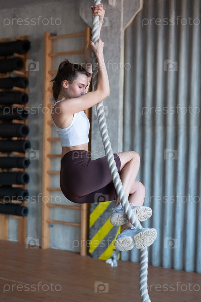 Подходящая женщина, альпинистская веревка в тренажерном зале. Фитнес, тренировки