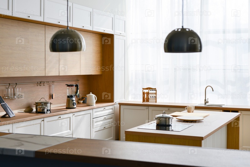 Современный новый светлый интерьер кухни с белой мебелью и столом