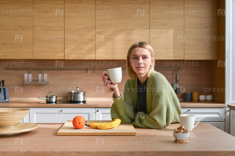 Молодая женщина дома на кухне завтракает