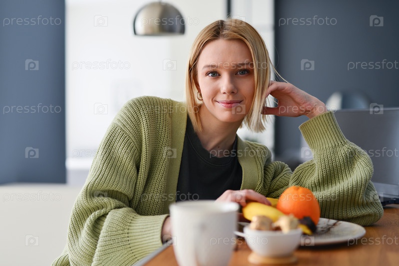 Портрет молодой женщины дома на кухне