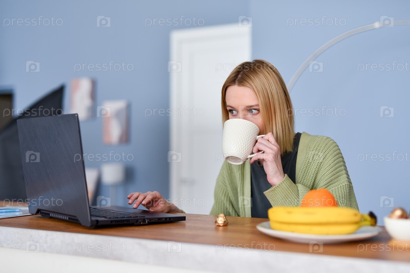 Молодая женщина на кухне с кружкой и смотрит на свой ноутбук