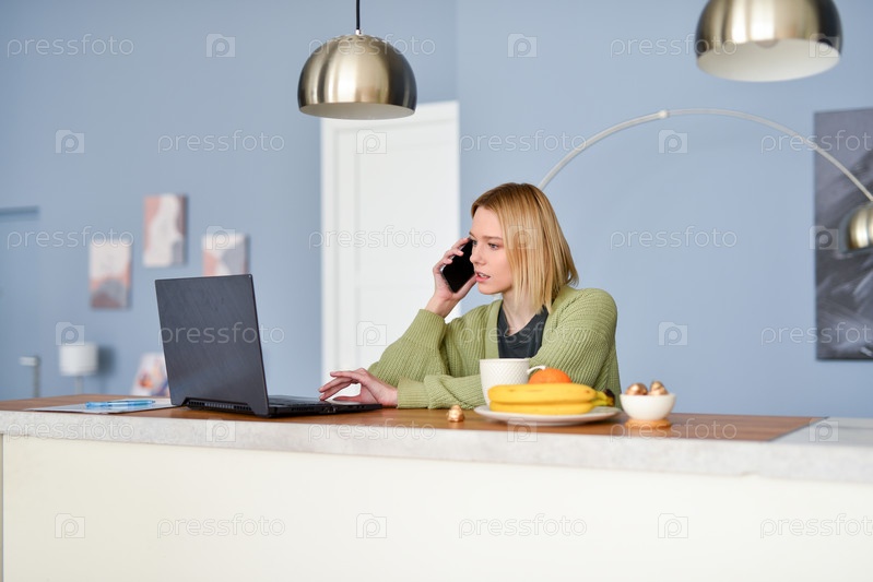 Молодая женщина использует ноутбук, разговаривает по телефону на кухне