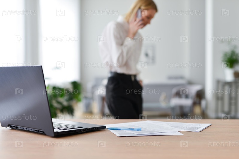 Женщина идет рядом со своим рабочим местом и разговаривает по телефону