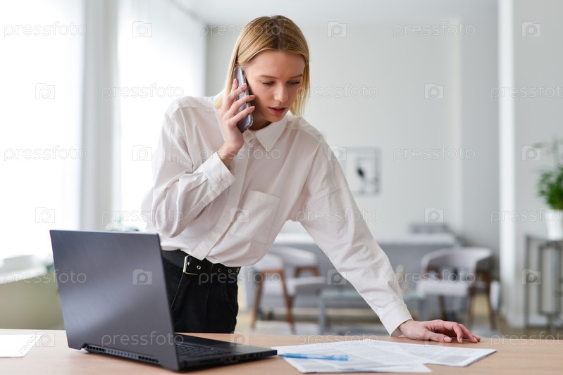 Женщина смотрит на документы и разговаривает по телефону