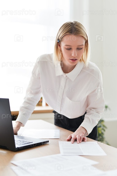Женщина, стоящая за своим столом, смотрит на свои бумаги