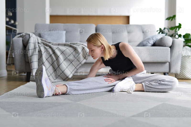 Женщина делает упражнения на растяжку дома