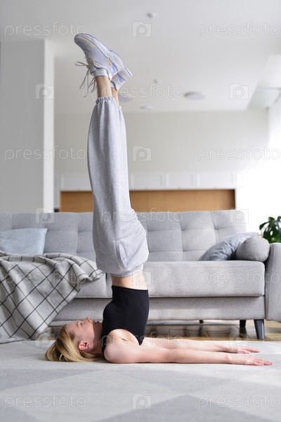 Подходящая женщина тренируется дома. Стойка на лопатках