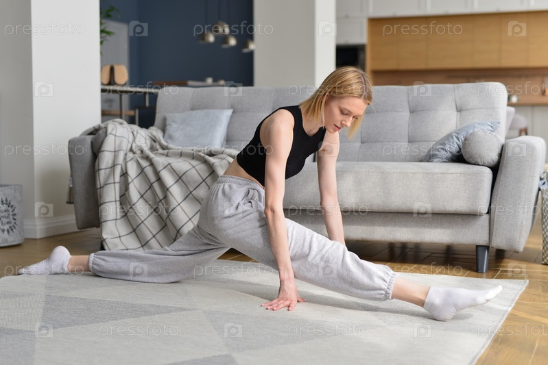 Женщина работает на шпагате, разогревая ноги