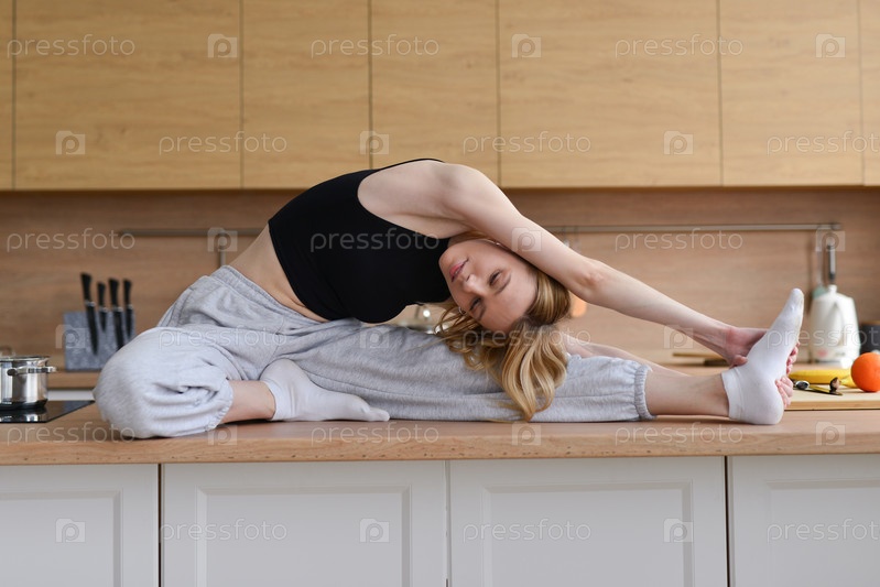 Женщина, сидящая за столом, делает растяжку
