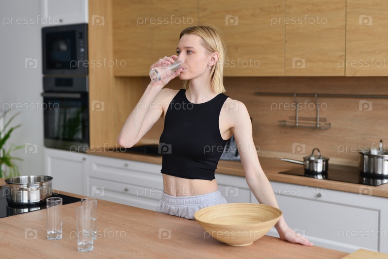 Женщина пьет воду на кухне