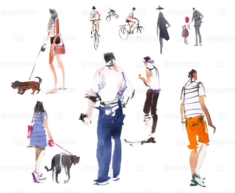 Различные типы ходячих людей Акварельные иллюстрации Быстрый рисунок эскиза