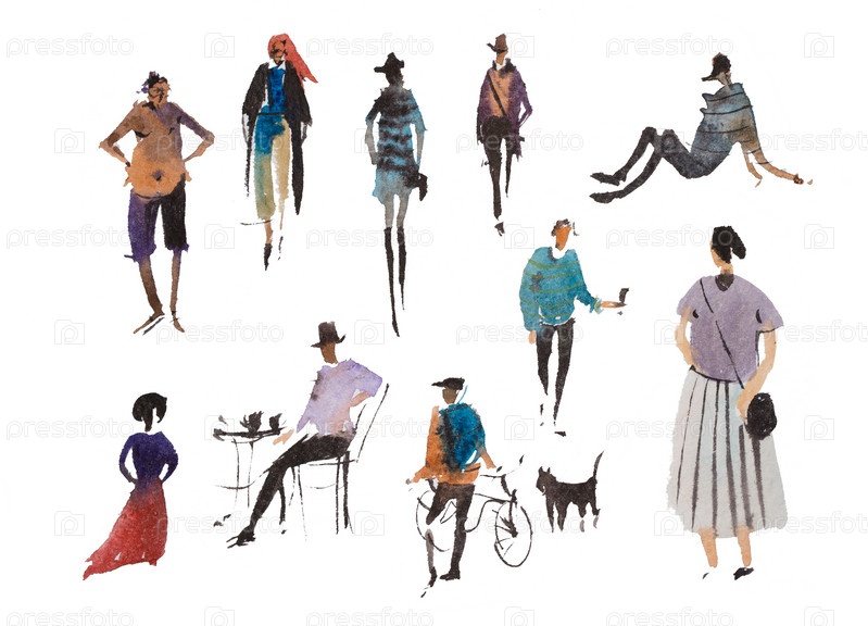 Различные типы идущих людей Акварельная иллюстрация Быстрый эскизный рисунок
