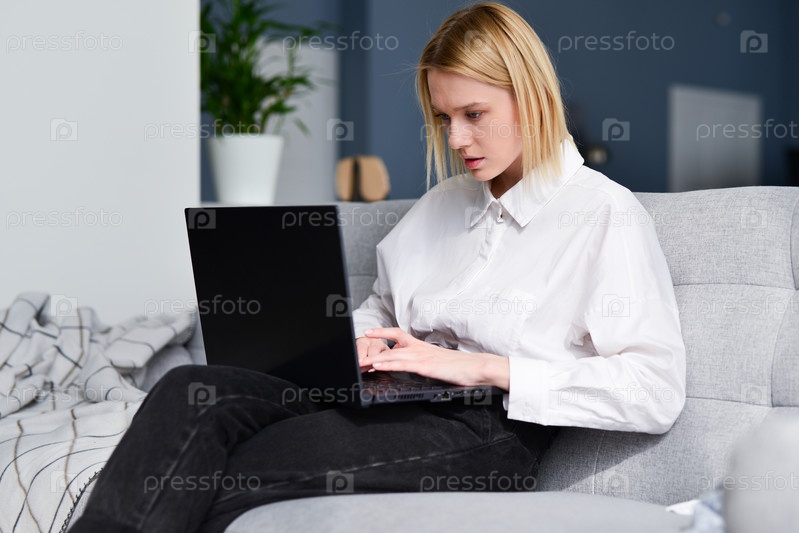 Женщина дома сидит на диване с ноутбуком
