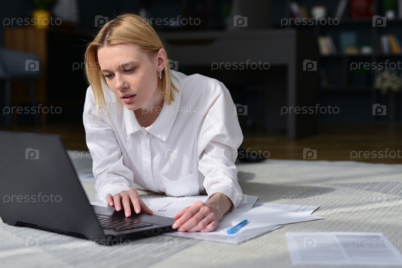 Женщина, лежащая на полу, студентка учится дома и работает со своим ноутбуком
