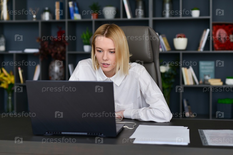 Деловая женщина работает дома с ноутбуком и бумагами на столе