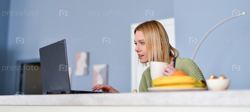 Молодая женщина завтракает или обедает дома со своим ноутбуком на кухне
