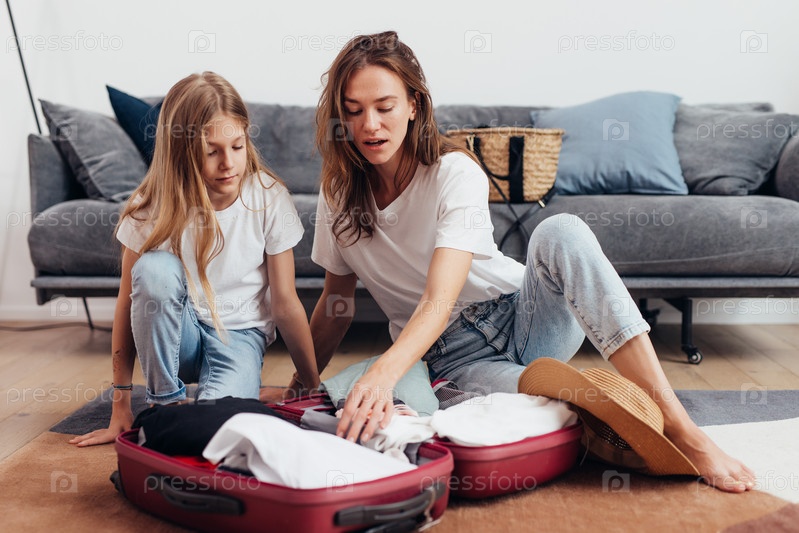 Мать и дочь собираются в путешествие с чемоданом