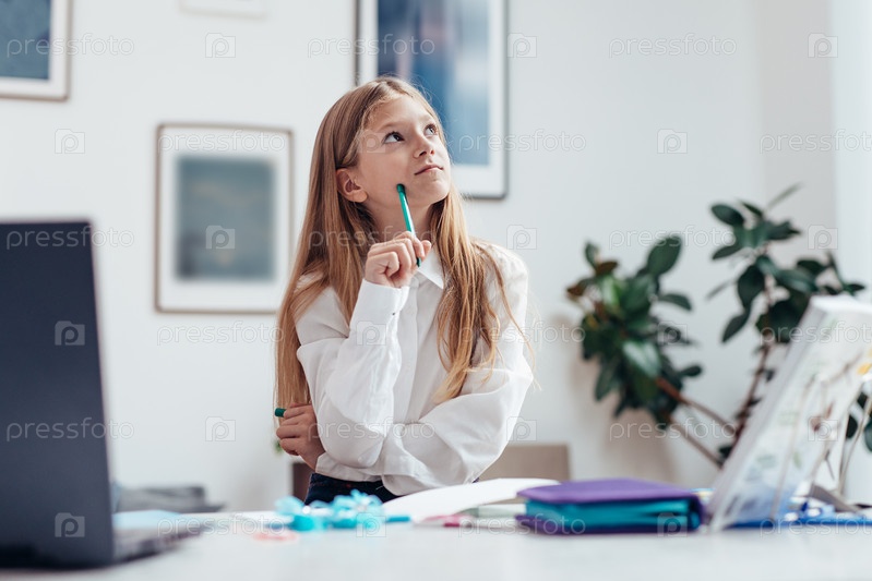 Девушка делает домашнее задание и сидит, задумчиво глядя в сторону