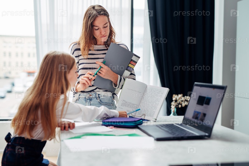 Мать стоит рядом с дочерью, делая домашнее задание