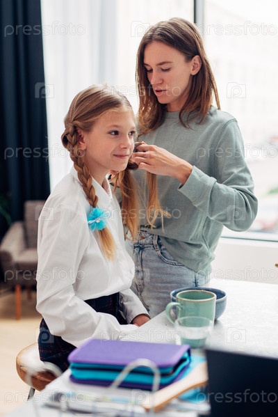 Мать заплетает косу дочери перед школой
