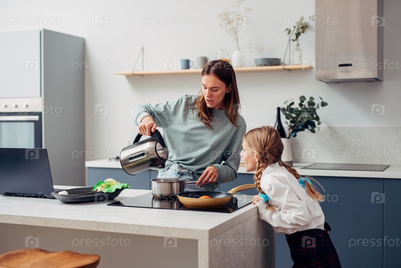 Женщина готовит еду рядом со своей любопытной дочерью-школьницей