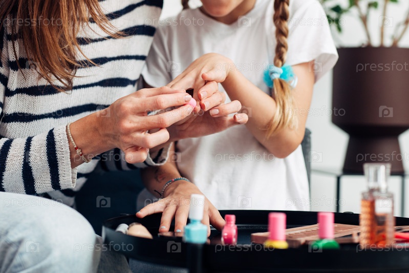Мать и дочь делают маникюр дома, красят ногти лаком для ногтей