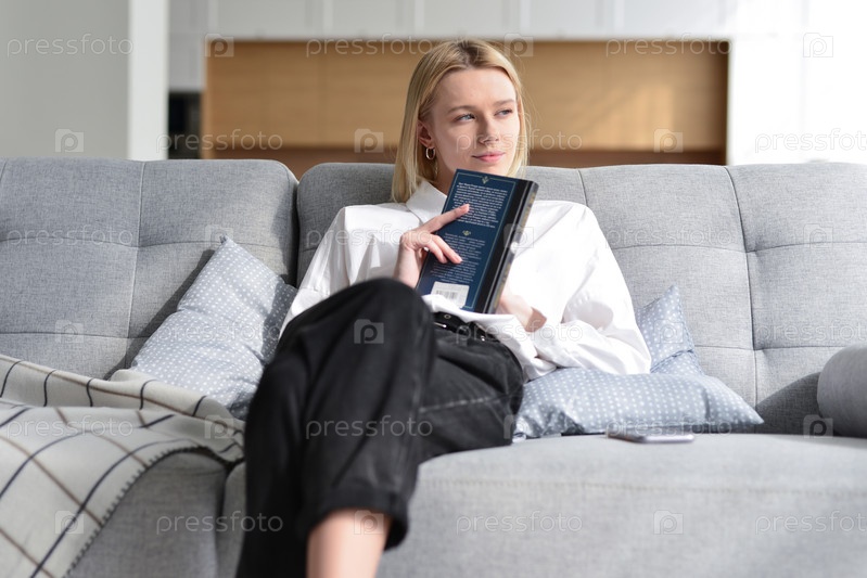 Женщина сидит на диване, размышляя с книгой