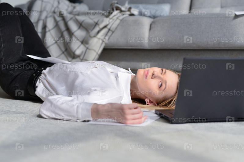 Женщина лежит на полу во время перерыва на работе