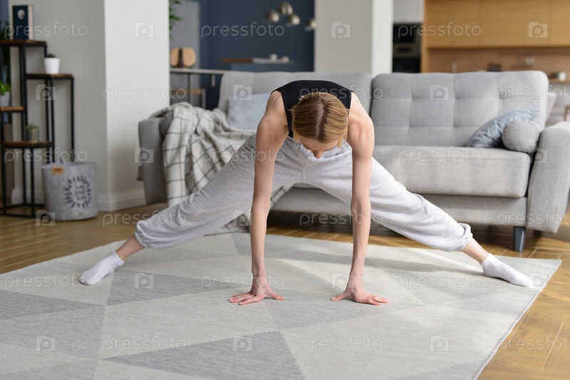 Женщина садится на шпагат, разогревая ноги