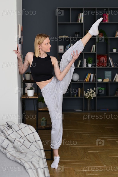Женщина тренируется высоко поднимать ногу