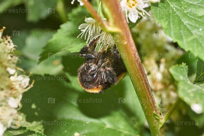 Шмель собирает пыльцу и нектар с цветков куста спиреи