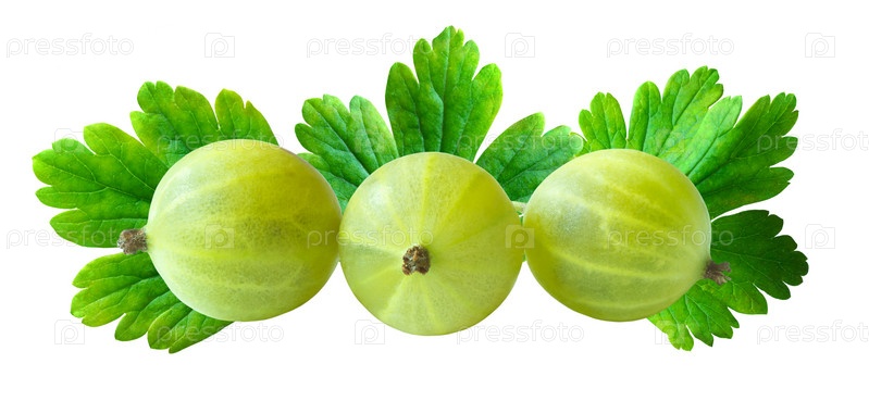 Три желтых ягоды виноградной лозы (Ribes uva-crispa) и листья на белом фоне