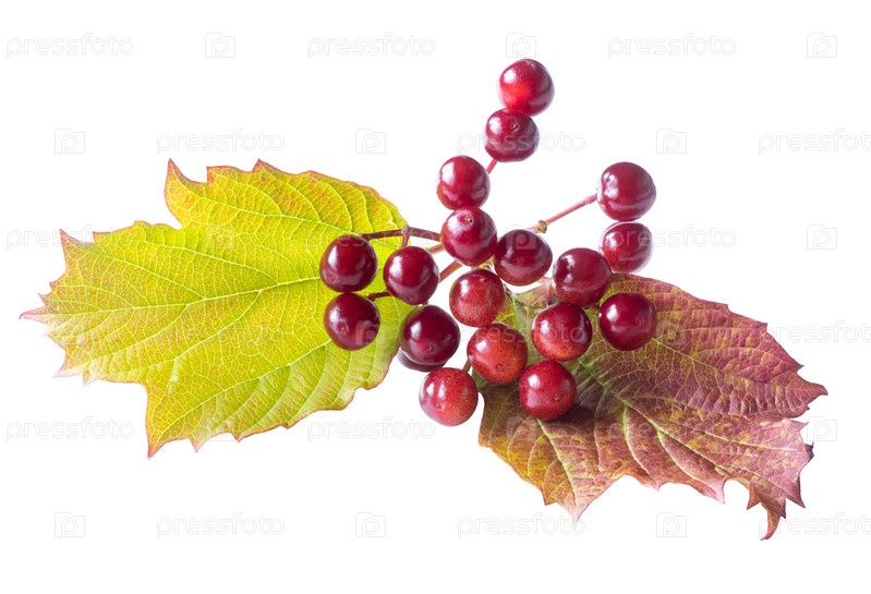Гроздь ягод калины с листвой, изолированной на белом