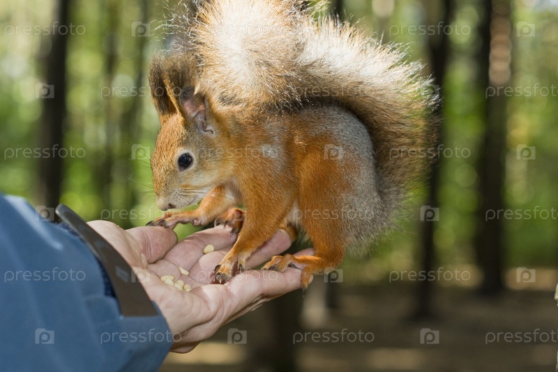Прирученная белка ест с рук