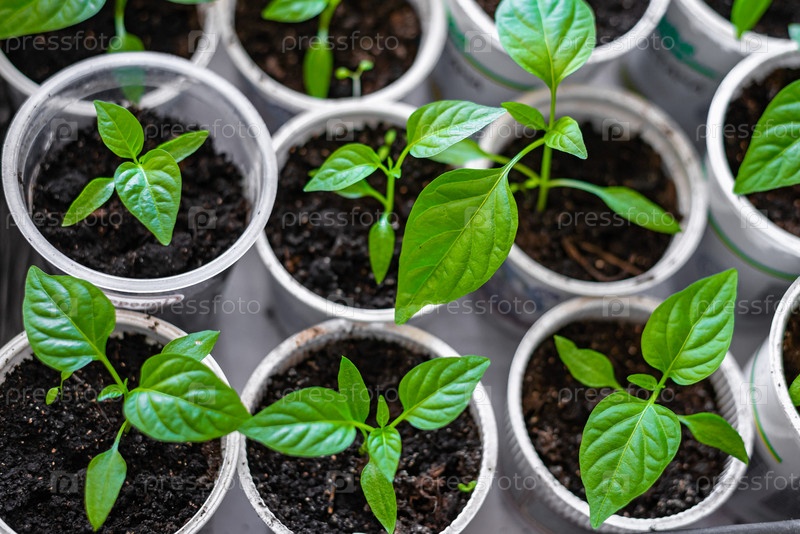 Домашнее садоводство крупным планом рассада перца в белых горшках, выращивание растений