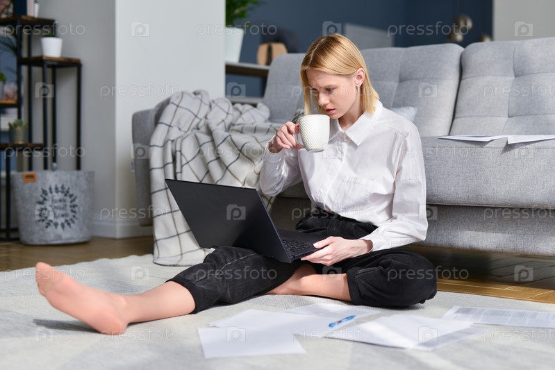 Женщина сидит на полу и работает со своим ноутбуком и документами