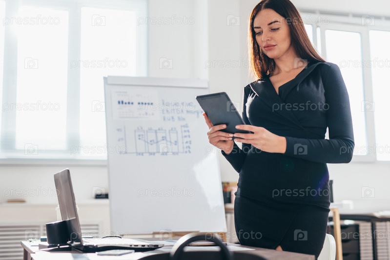 Портрет деловой женщины в офисе, стоящей возле ее стола