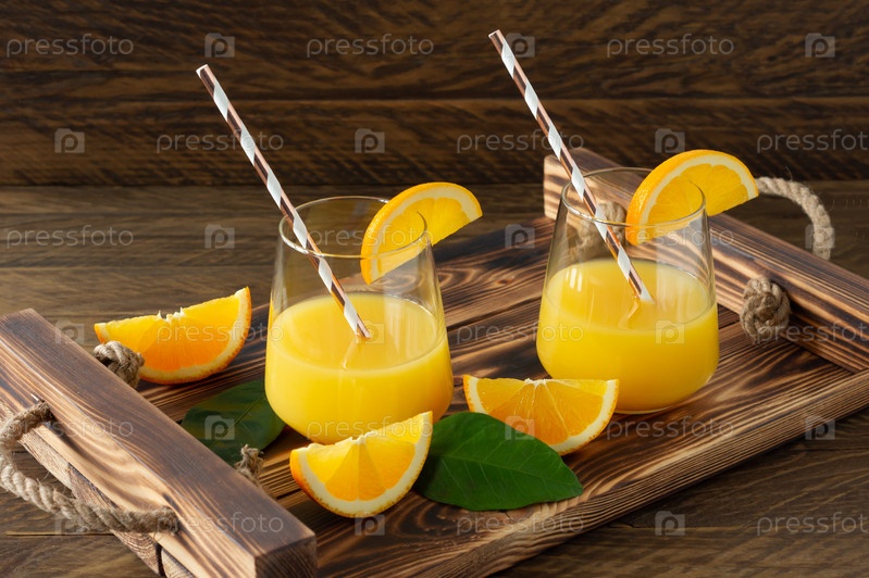Свежий апельсиновый сок в стаканах с разрезанными апельсинами на деревянном подносе. Деревенский натюрморт с цитрусовыми