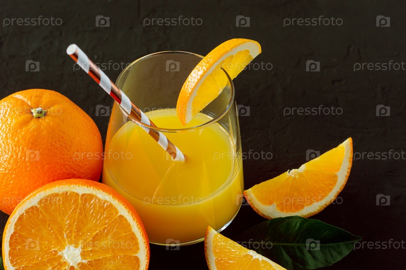 Стакан со свежим апельсиновым соком с бумажной соломой, апельсинами и зелеными листьями на темном фоне