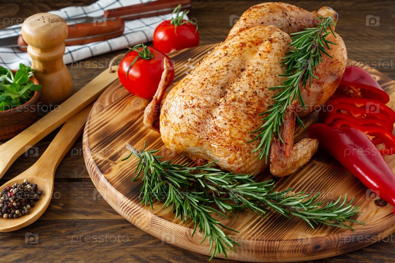 Запеченная курица с золотистой корочкой с овощами и зеленью на деревянном фоне