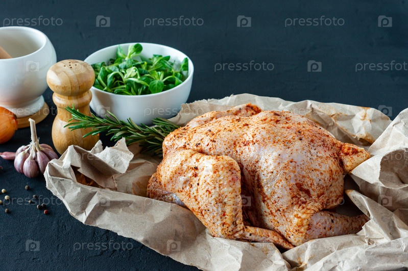 Свежий сырой цыпленок на бумаге для выпечки и специях для приготовления пищи