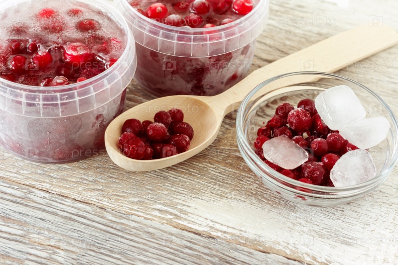 Замороженная здоровая клюква в пластиковых контейнерах с кубиком льда на деревянном фоне