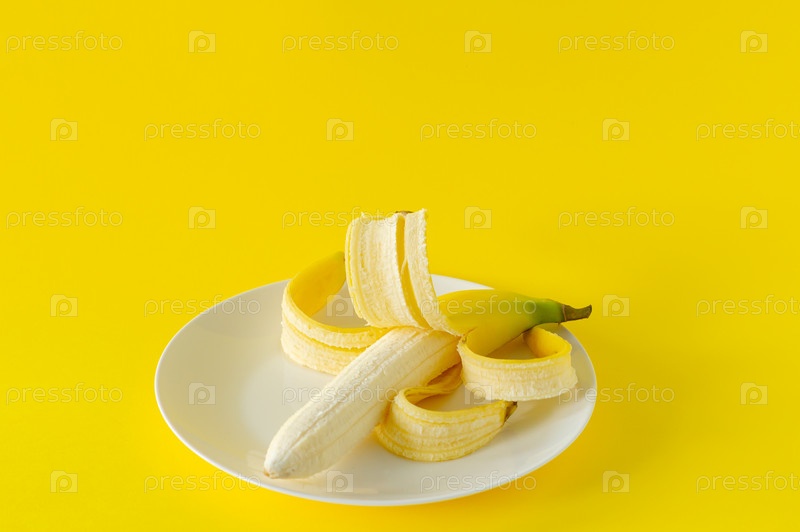 Спелый банан на черной тарелке на желтом фоне. Тропические фрукты для еды