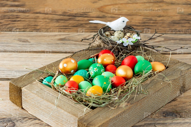 Красочные раскрашенные вручную пасхальные яйца и гнездо с птицей в деревянном ящике на деревянном столе