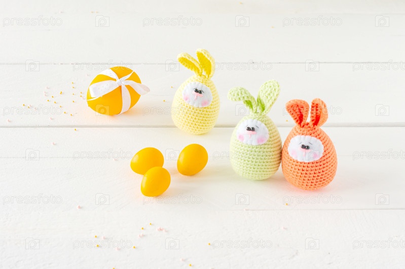 Украшение композиции Счастливой Пасхи праздник фон концепции. Пасхальные крашеные яйца с вязаными яйцами ручной работы на белом деревянном столе. Пастельные цвета