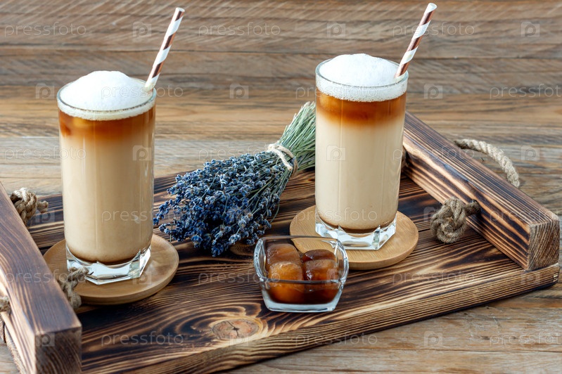 Кофейная чашка латте с домашним лавандовым сиропом и цветами на деревянном подносе. Уютный завтрак