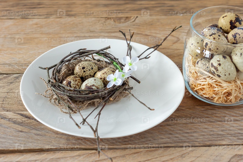 Композиция с гнездом веточек и перепелиными яйцами на тарелке. Пасхальные праздники в деревенском стиле