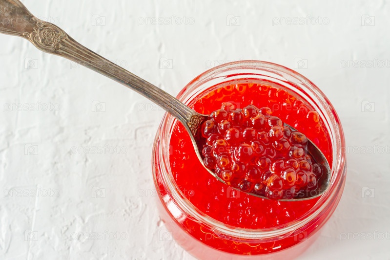 Красная икра в стеклянной банке с серебряной ложкой. Морепродукты. Здоровое питание. Диета. белый фон