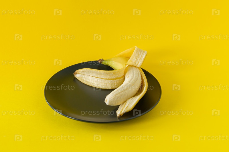 Спелый банан на черной тарелке на желтом фоне. Тропические фрукты для еды
