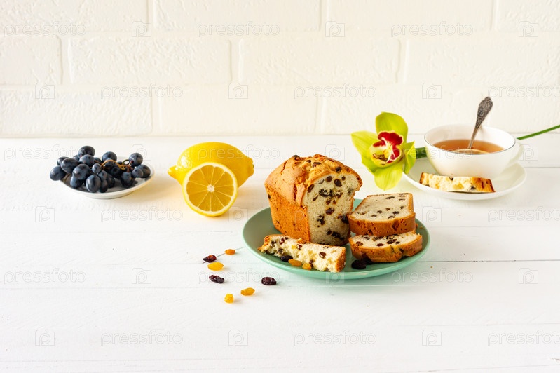 Домашняя свежеиспеченная лепешка с изюмом. Традиционное угощение к чаю или кофе. Фунтовый пирог. Вкусный завтрак